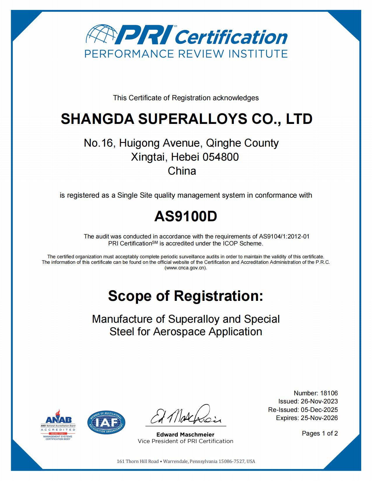 AS9100 Aviation Certification Certificate